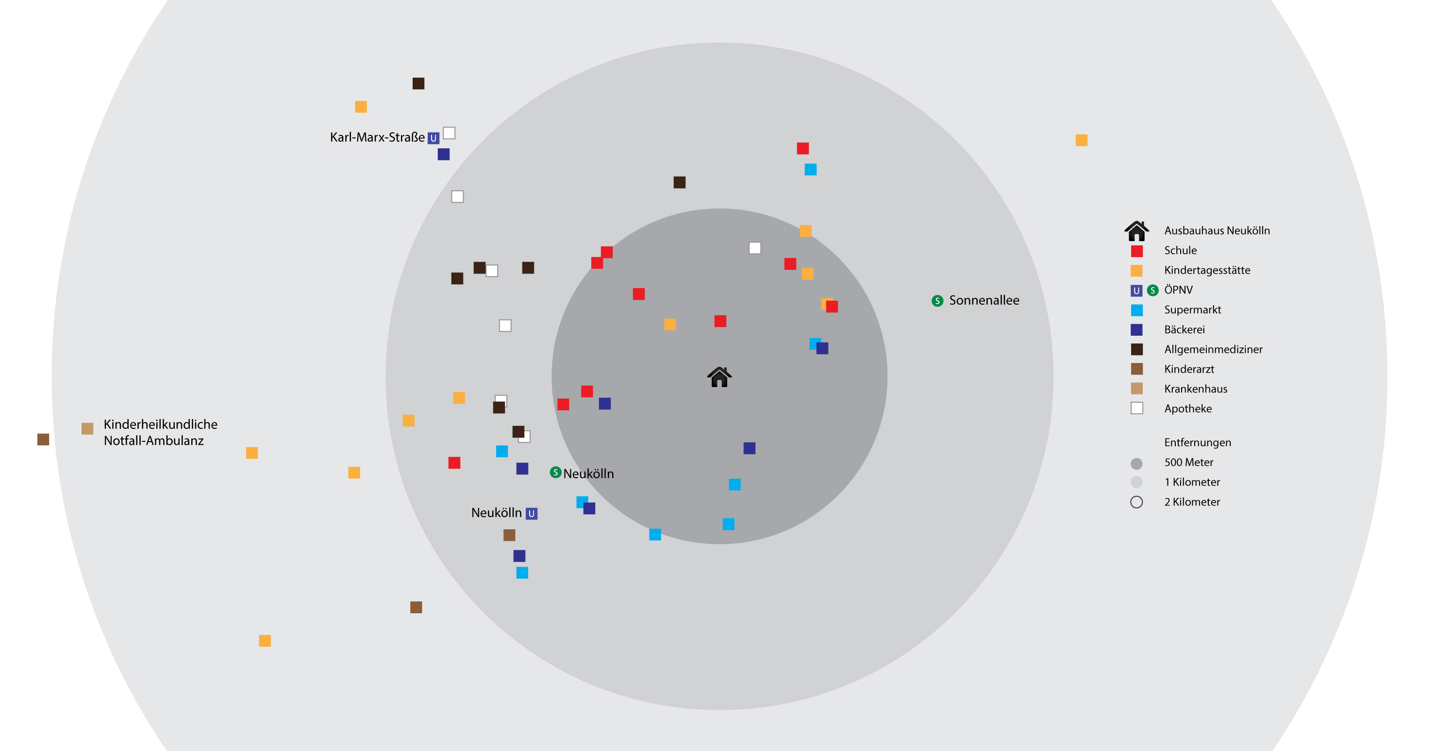 Die nachfolgend verlinkten Grafiken zeigen die gute Infrastruktur dieses Viertels: